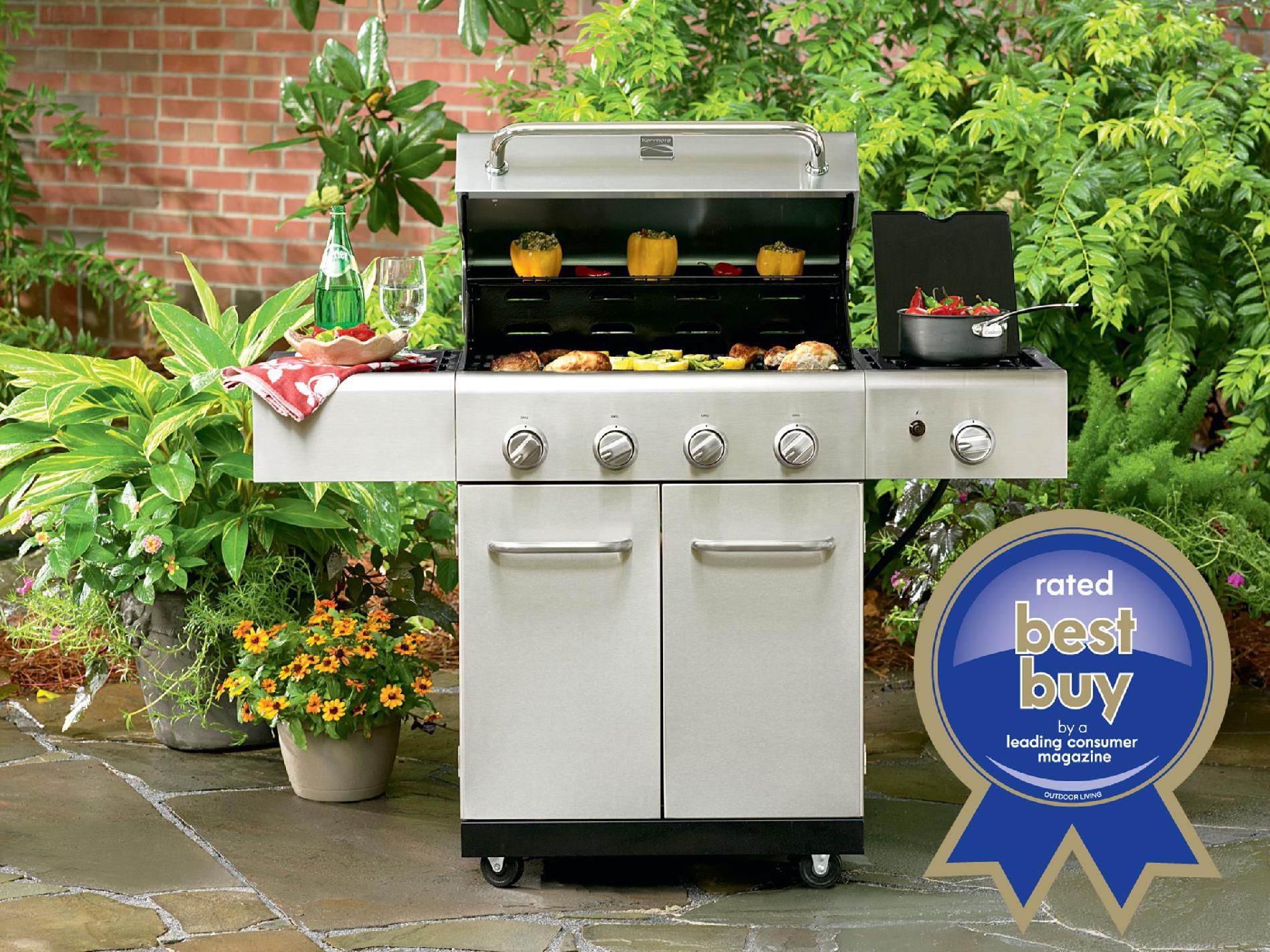Overview Kenmore 4-Burner Stainless Steel Gas Grill Silver, Kenmore Stainless Steel Grill Has You Cooking to Perfection Get more barbecuing bang for your buck with the Kenmore stainless 4-burner grill. Featuring 588 sq. in. of grilling space on porcelain enameled cast iron cooking grids, this sophisticated grill offers plenty of space to grill up a feast for the family and then some. A push of a button on the K enmore stainless steel grill ignites the burners, each of which comes with its own knob so you have total control over your cookout. The convenient warming rack and electronic ignition make it fantastically functional, and the rust-resistant stainless steel construction makes it a stylish and durable investment for years to come. Start your picnic wherever you want and get grilling in style.